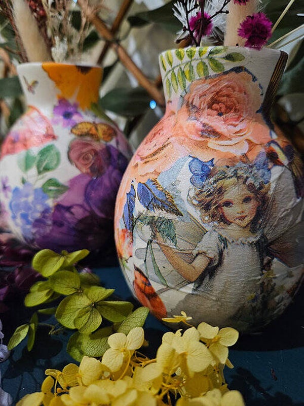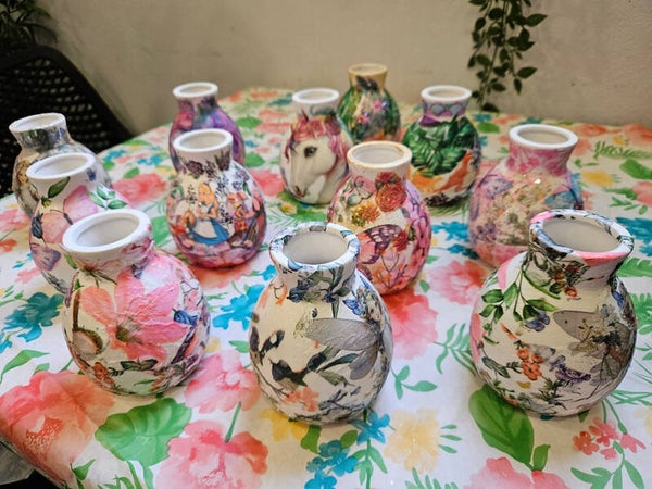 Using the large range of paper napkins on offer, choose your colours and patterns before learning the art of decoupage. Once our vase is complete, choose from a beautiful range of dried flowers and create a posy to add to it.
